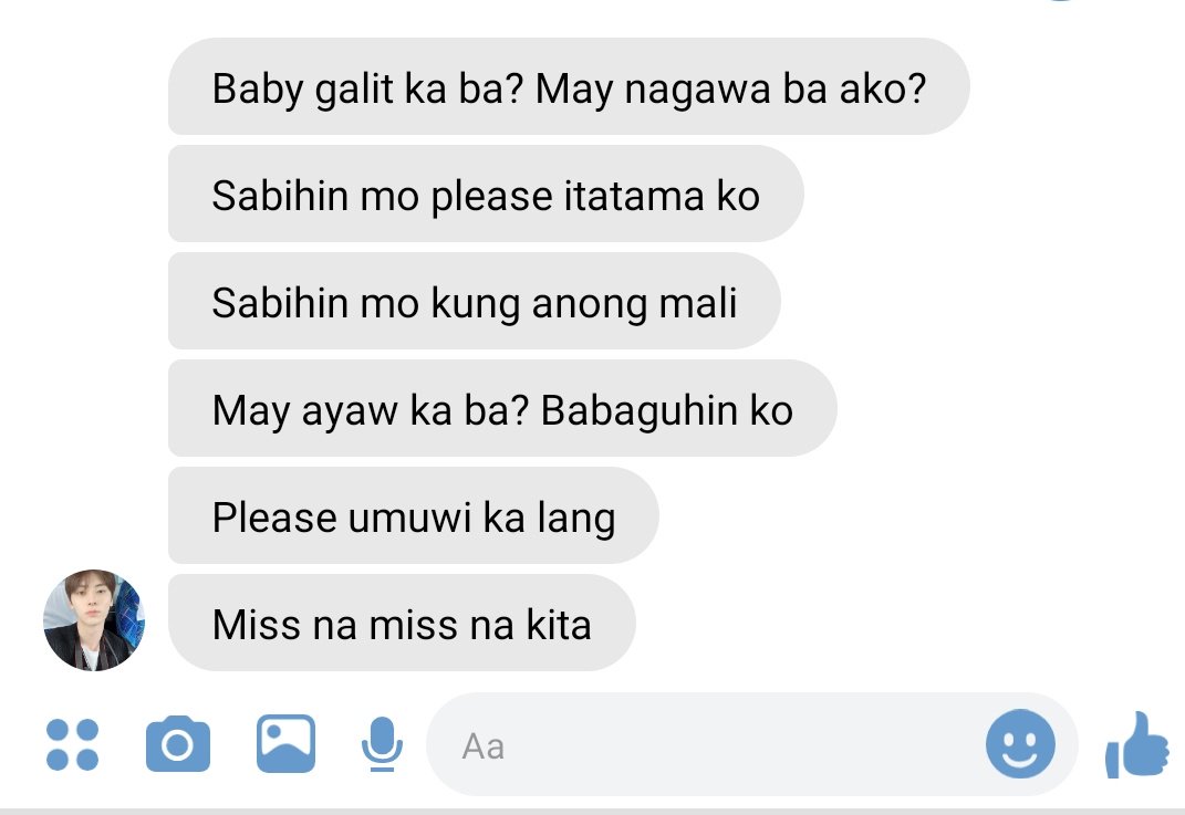 Tinatamad akong magexplain. Di ka pa rin niya makita. Yakapin mo naman ako Kumusta ka na Miss na kita Still there Tagal mo mag-reply Joke lang Totoo yun kahit.